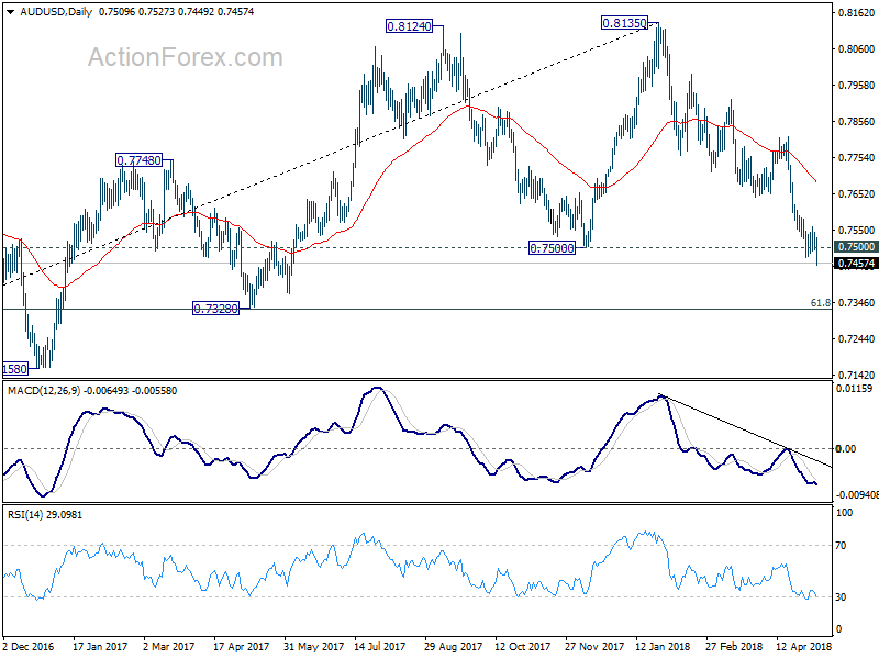 Selling of AUD and EUR came in later. AUD/USD traders should have finally made up them mind to push the pair through 0.7500 key support level. Such development should confirm medium term reversal in the pair and should pave the way to 0.7328 support next.
