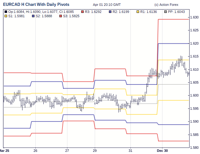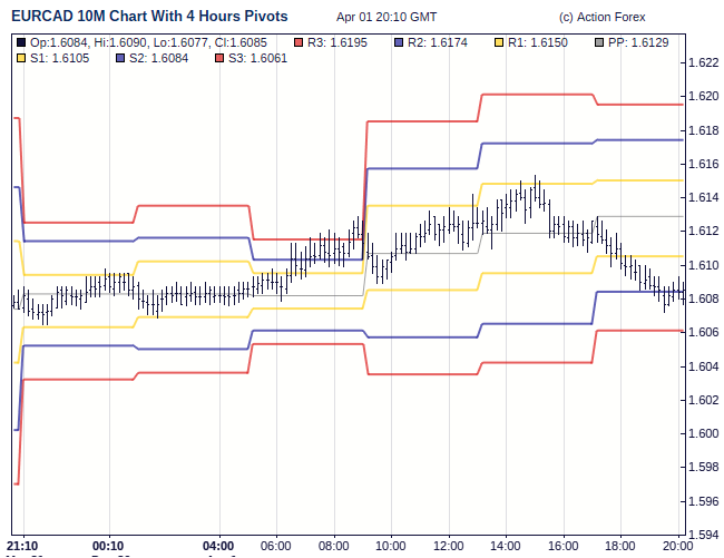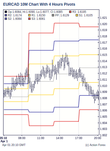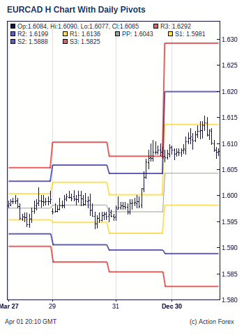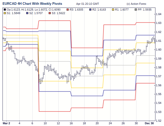 Pivot points are very useful tools that use the previous bars' highs, lows and closings to project support and resistance levels for future bars. Daily pivot points are useful for swing trading; while 4 hour pivot points are useful for intraday trading. Longer term pivot points provide an idea of where key support and resistance levels should be. Place the pivot points on your charts and see how traders appear to give pivot point levels a lot of respect.