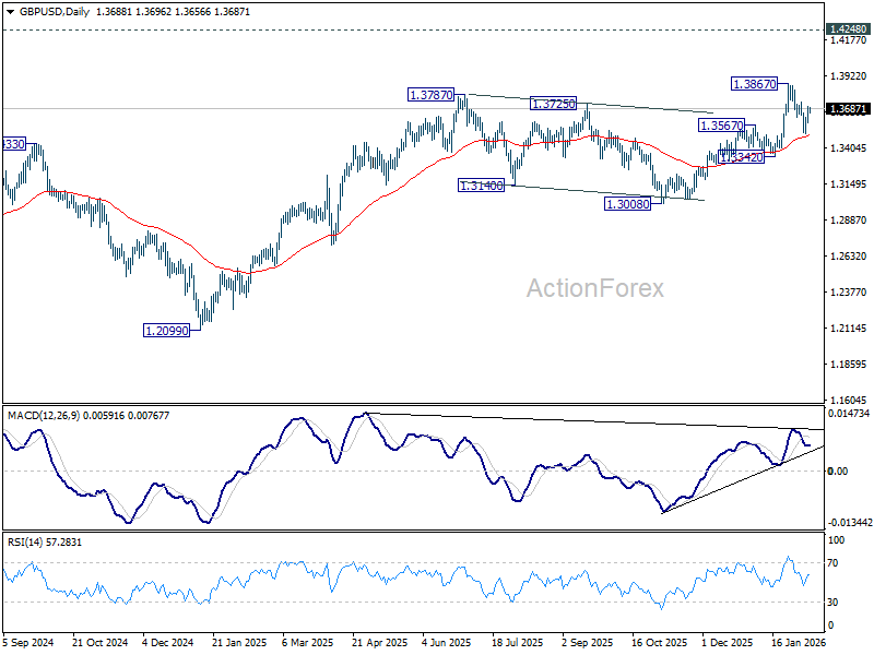 No change in GBP/USD's outlook and intraday bias remains neutral. On the upside, firm break of 1.3732 resistance will suggest that pullback from 1.3867 has completed as a correction at 1.3507. Retest of 1.3867 should be seen first. Firm break there will resume larger up trend towards 1.4284 key resistance. On the downside, however, sustained trading below 55 D EMA (now at 1.3492) will raise the chance of larger scale correction, and target 1.3342 support for confirmation.