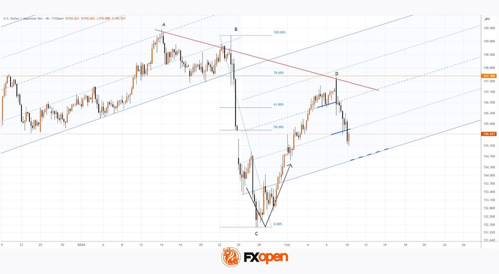 - → lower highs A–B–D have formed on the USD/JPY chart, with a bearish trend line drawn through them.