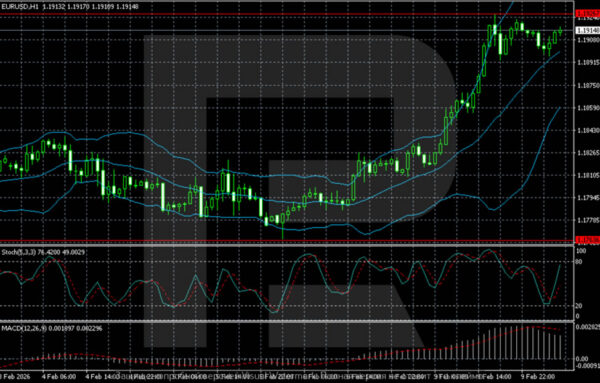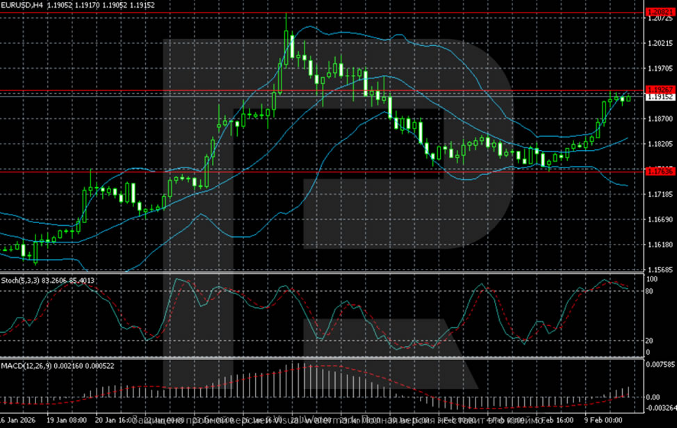 On the shorter-term H1 time frame, upward momentum remains confined to the short term. The price is moving along the upper Bollinger band after a sharp upward acceleration. It is now consolidating just below resistance at 1.1920-1.1950. Oscillators are in the overbought zone, raising the risk of a pause or shallow pullback, although the overall structure remains intact.