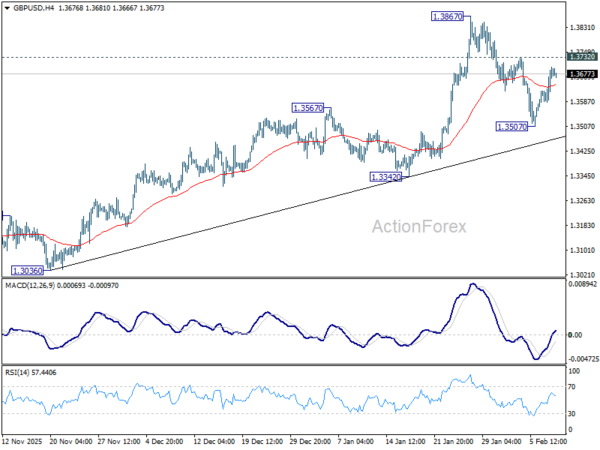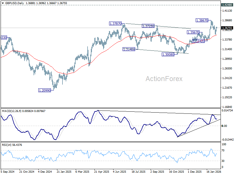 Intraday bias in GBP/USD remains neutral at this point. On the upside, firm break of 1.3732 resistance will suggest that pullback from 1.3867 has completed as a correction at 1.3507. Retest of 1.3867 should be seen first. Firm break there will resume larger up trend towards 1.4284 key resistance. On the downside, however, sustained trading below 55 D EMA (now at 1.3492) will raise the chance of larger scale correction, and target 1.3342 support for confirmation.
