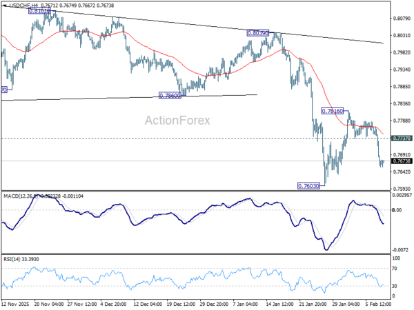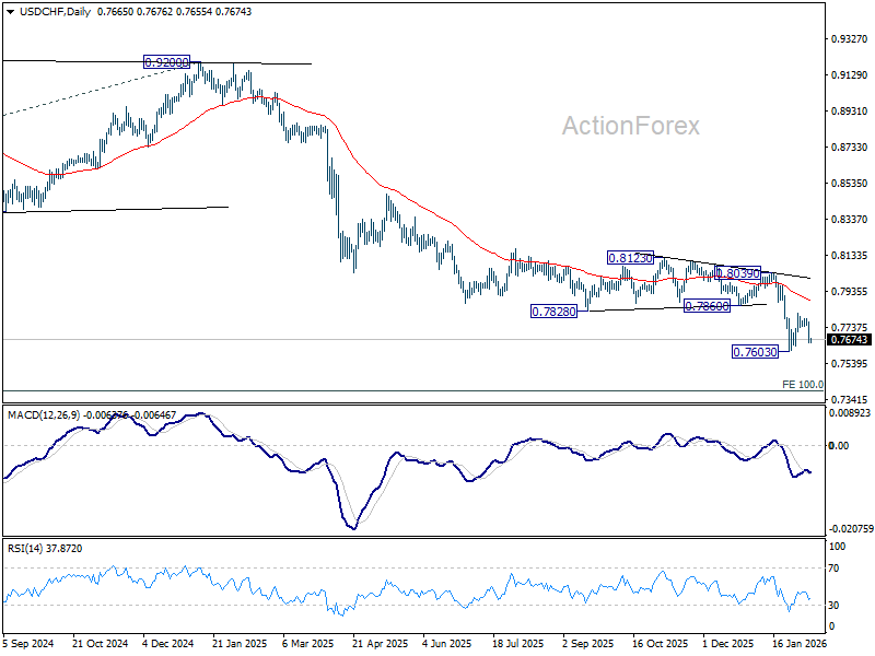 Intraday bias in USD/CHF remains on the downside for retesting 0.7603 low. Decisive break there will resume larger down trend to 0.7382 projection level next. On the upside, though, above 0.7737 minor resistance will delay the bearish case and extend the corrective pattern from 0.7603 with another leg.
