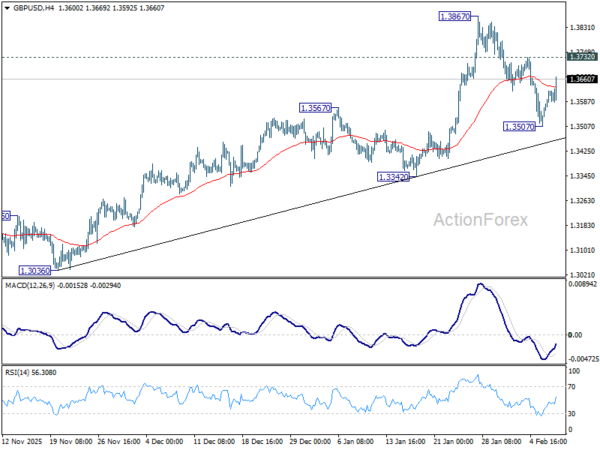 Intraday bias in GBP/USD remains neutral for the moment. On the downside, below 1.3507 will resume the fall from 1.3867 to 55 D EMA (now at 1.3490). Sustained break there will raise the chance of larger scale correction, and target 1.3342 support for confirmation. On the upside, above 1.3732 minor resistance will bring retest of 1.3867. Firm break there will resume larger up trend towards 1.4284 key resistance.