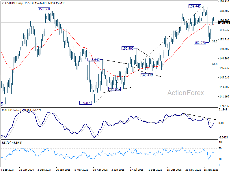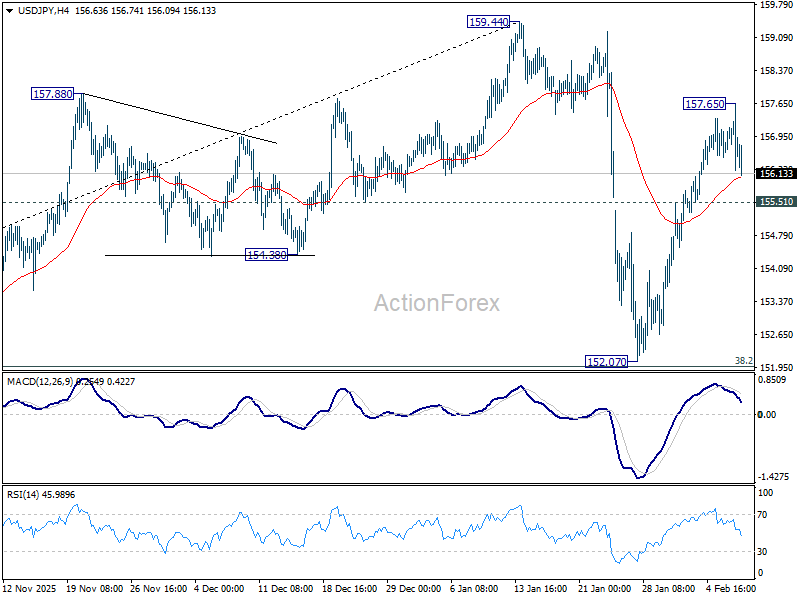 Intraday bias in USD/JPY remains neutral for the moment. Rise from 152.07 is seen as the second leg of the corrective pattern from 159.44. Above 157.65 will target a retest on 159.44 high. However, on the downside, below 155.51 minor support will bring deeper fall as another falling leg. But downside should be contained by 38.2% retracement of 139.87 to 159.44 at 151.96.
