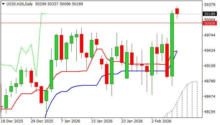 Dow eases from new record high (50337) on Monday but remains steady and holds above broken magic 50K barrier that was taken out last Friday after almost 2.7% advance (the biggest daily gain since 9 April 2025).