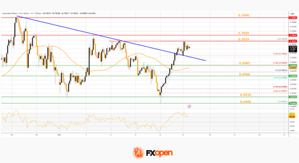 - There was a break above a key bearish trend line with resistance at 0.7000 on the hourly chart of AUD/USD at FXOpen.