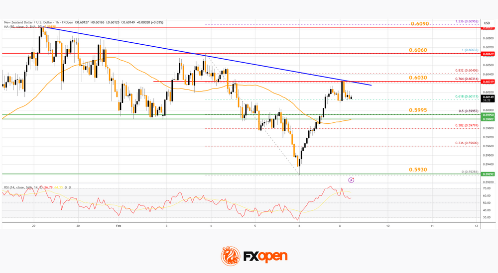 - There is a major bearish trend line forming with resistance at 0.6030 on the hourly chart of NZD/USD at FXOpen.