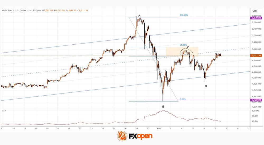 As shown by today’s XAU/USD chart, gold began the week on a bullish note: trading opened with a bullish gap above Friday’s high, lifting the price above the psychological $5,000 level.