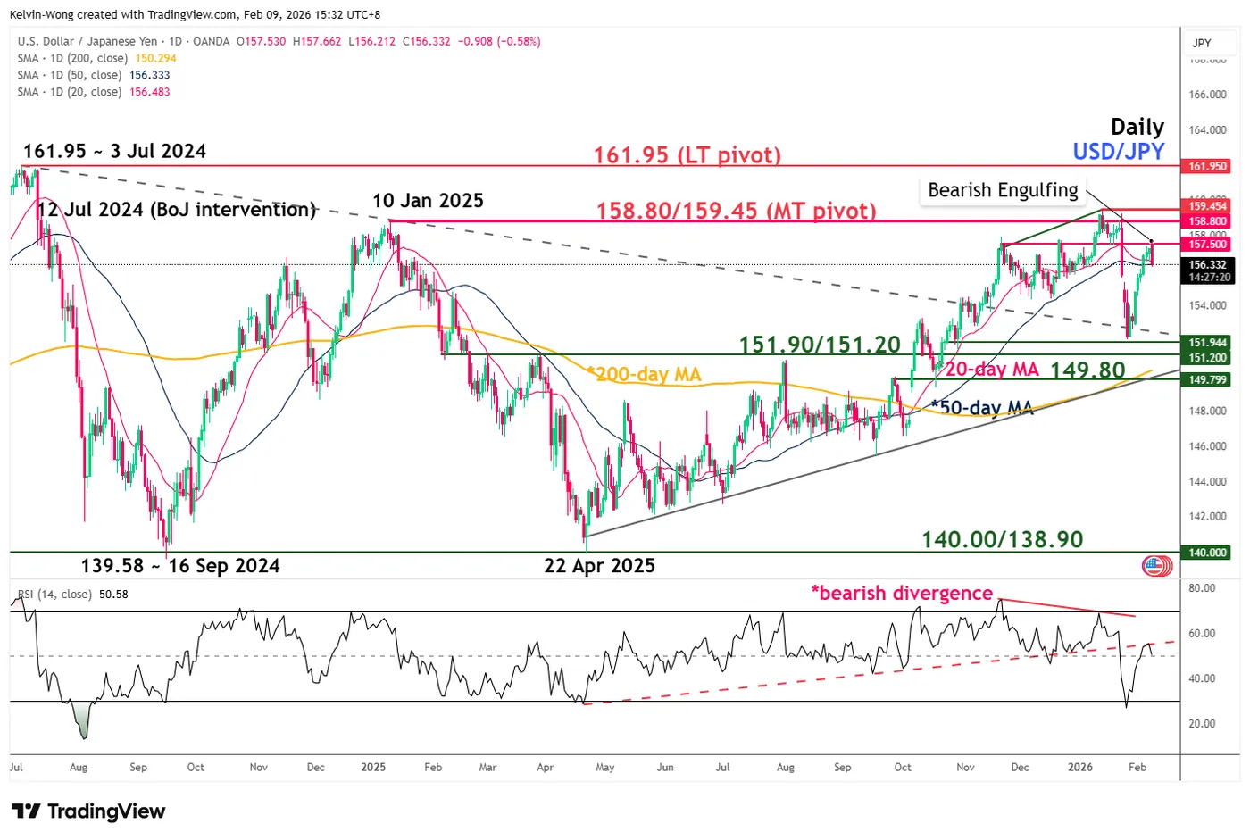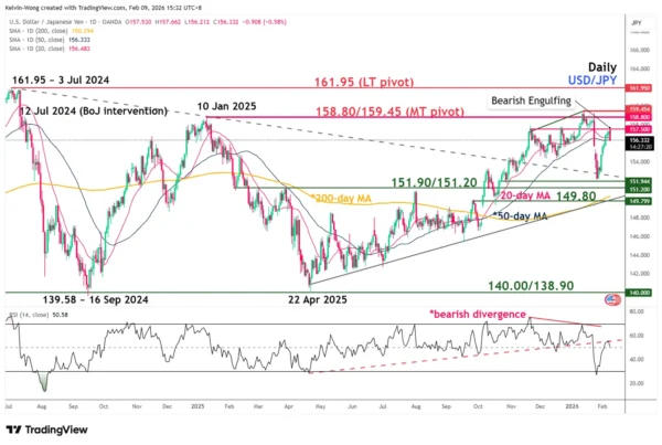 - Based on the recent two sessions of price actions from 6 February to 9 February 2026, USD/JPY has formed an impending daily “Bearish Engulfing” candlestick pattern, which increases the odds of a bearish reversal (see Fig. 3).