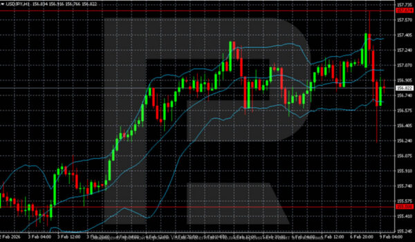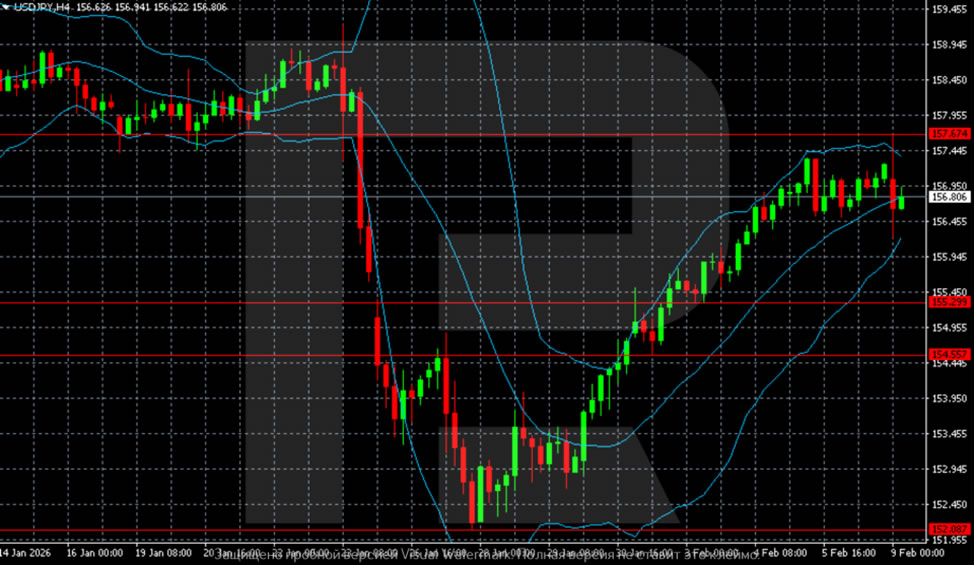 On the H4 chart for USD/JPY, following a sharp decline at the end of January, a local bottom formed in the 152.00-152.20 zone, from which the pair began to recover. This impulsive growth was accompanied by movement along the upper border of the Bollinger Bands. The price is now trading below recent highs and consolidating in the 155.80-157.70 range. Volatility has decreased, and the structure remains corrective. However, momentum weakened, and the market has entered a pause phase under resistance.