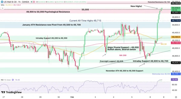 Dow Jones (CFD) 1H Chart – February 6, 2026 – Source: TradingView