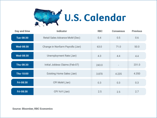 The coming week is relatively quiet for Canadian economic data releases with no major reports scheduled. As a result, attention will shift to developments south of the border with January’s U.S labour market data on Wednesday and inflation on Friday.