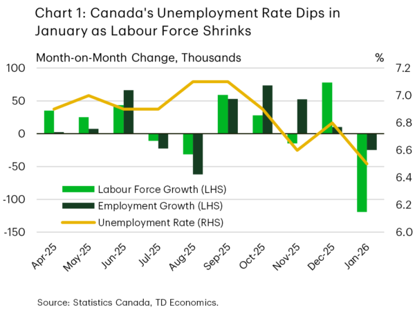The first jobs report for 2026 was the main economic event this week. January’s jobs numbers were full of surprises. The unemployment rate dropped three ticks to 6.5%, reversing December’s increase. This occurred despite the economy losing 25k jobs in January, since the labour force contracted by a larger 120k people. Large swings in the month-to-month labour force survey numbers are common, but January was the biggest drop in the labour force since early-2021 (Chart 1). With Canada’s population projected to contract this year, the unemployment rate can continue to fall even if Canada is losing jobs.
