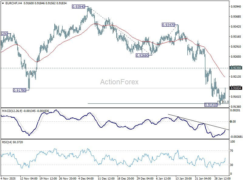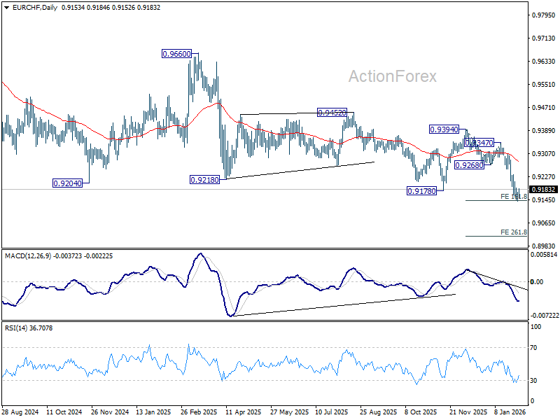 EUR/CHF recovered after hitting 161.8% projection of 0.9394 to 0.9268 from 0.9347 at 0.9143 and intraday bias is turned neutral for consolidations. Upside of recovery should be limited by 0.9235 to bring another fall. Decisive break of 0.9143 will extend larger down trend to 261.8% projection at 0.9017.