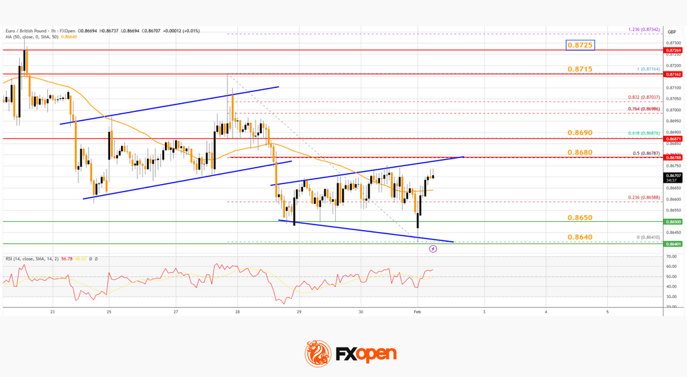 On the hourly chart of EUR/GBP at FXOpen, the pair started a steady decline from well above 0.8725. The Euro traded below 0.8690 against the British Pound.