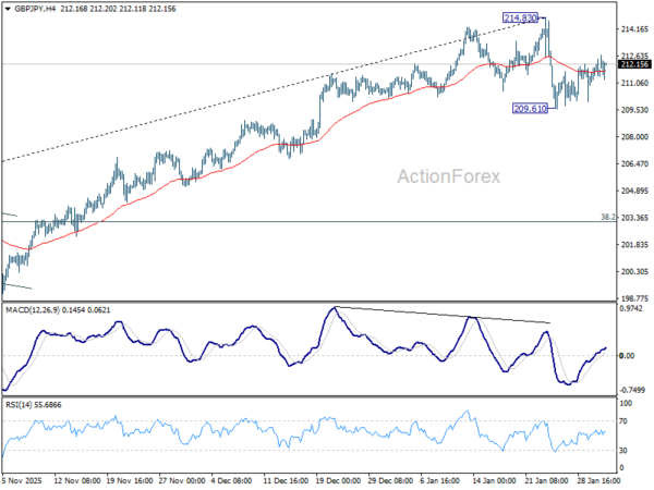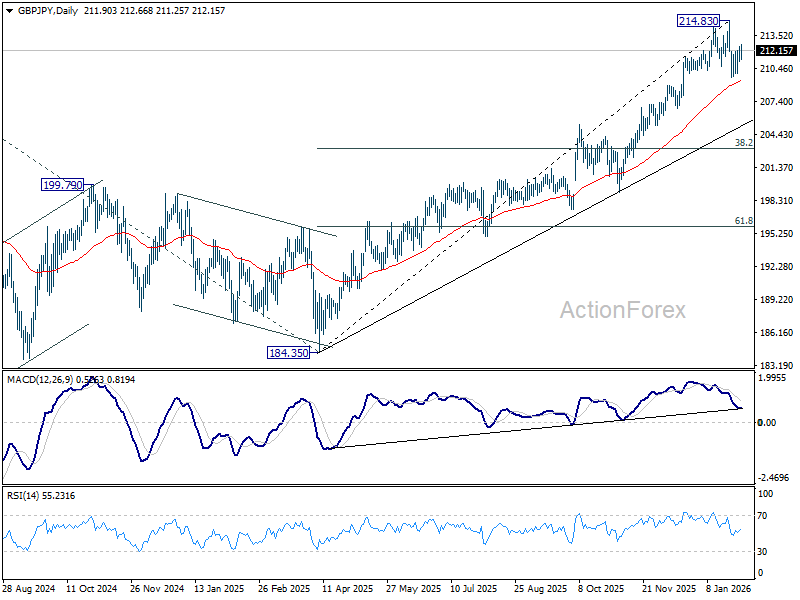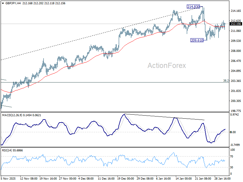 Consolations continues in GBP/JPY and intraday bias stays neutral. Risk will stay on the downside as long as 214.83 holds, even in case of strong recovery. Below 209.61, and sustained break of 55 D EMA (now at 209.27) will argue that it's correcting whole rise from 184.35 and target 38.2% retracement of 184.35 to 214.83 at 203.18.