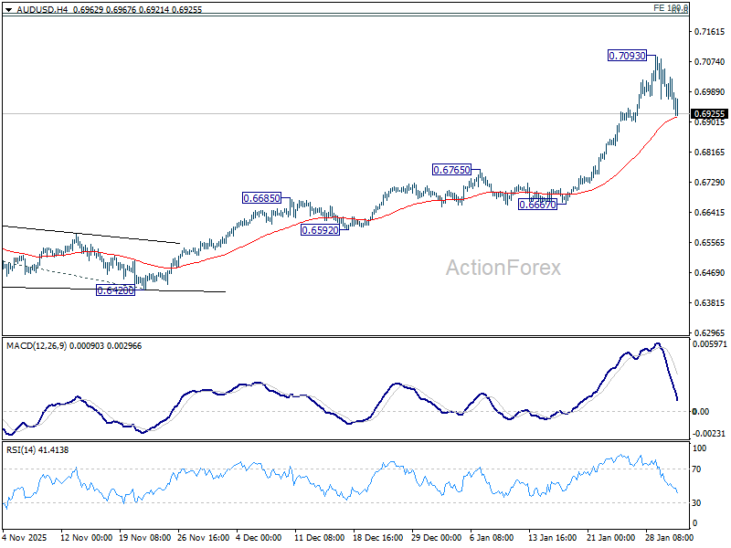Intraday bias in AUD/USD stays neutral for consolidations below 0.7093. Risk will stay on the upside as long as 55 4H EMA (now at 0.6914) holds. Above 0.7093 will extend larger up trend to 100% projection of 0.5913 to 0.6706 from 0.6420 at 0.7213 next. Nevertheless, break of 55 4H EMA will confirm short term topping, and bring lengthier consolidations before rally resumption.