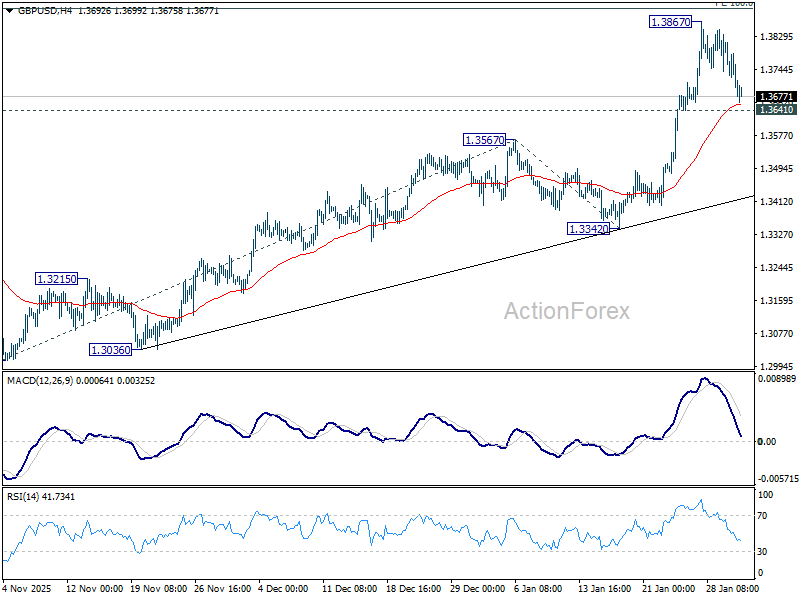 Intraday bias in GBP/USD remains neutral and more consolidations could be seen. But downside should be contained by 1.3641 to bring another rally. Firm break of 100% projection of 1.3008 to 1.3567 from 1.3342 at 1.3901 will pave the way to 161.8% projection at 1.4246, which is close to 1.4248 key structural resistance. However, break of 1.3641 will turn bias to the downside for deeper pullback.