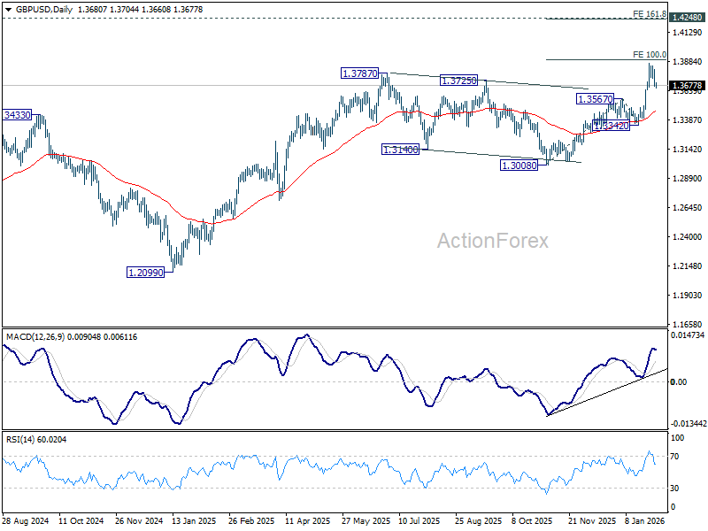 In the bigger picture, rise from 1.0351 (2022 low) is resuming by breaking through 1.3787 high. Further rally should be seen to 1.4284 key resistance (2021 high). Decisive break there will add to the case of long term bullish trend reversal. For now, outlook will stay bullish as long as 1.3008 support holds, even in case of deep pullback.