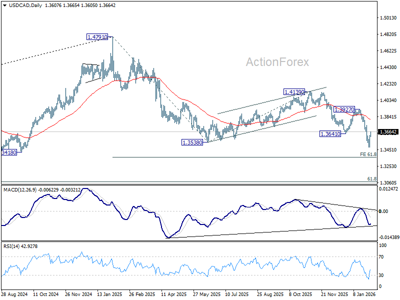 Intraday bias in USD/CAD is turned neutral with current recovery and some consolidations would be seen above 1.3480. Further decline is in favor as long as 55 4H EMA (now at 1.3664) holds. Below 1.3480 will target 61.8% projection of 1.4791 to 1.3538 from 1.4139 at 1.3365. However, firm break of 55 4H EMA will indicate short term bottoming, and bring stronger rebound towards 55 D EMA (now at 1.3805) instead.