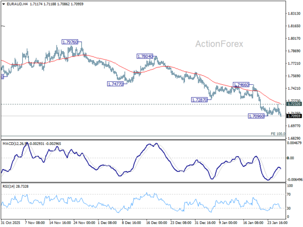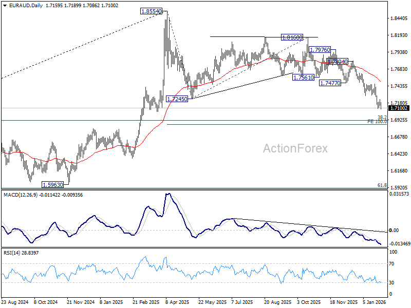 Intraday bias in EUR/AUD is back on the downside with breach of 1.7096 temporary low. Current fall from 1.8160 is seen as the third leg of the corrective pattern from 1.8554. Deeper decline should be seen to 100% projection of 1.8554 to 1.7245 from 1.8160 at 1.6851. Nevertheless, break of 1.7232 resistance will now indicate short term bottoming, and turn bias back to the upside for stronger rebound to 1.7466.