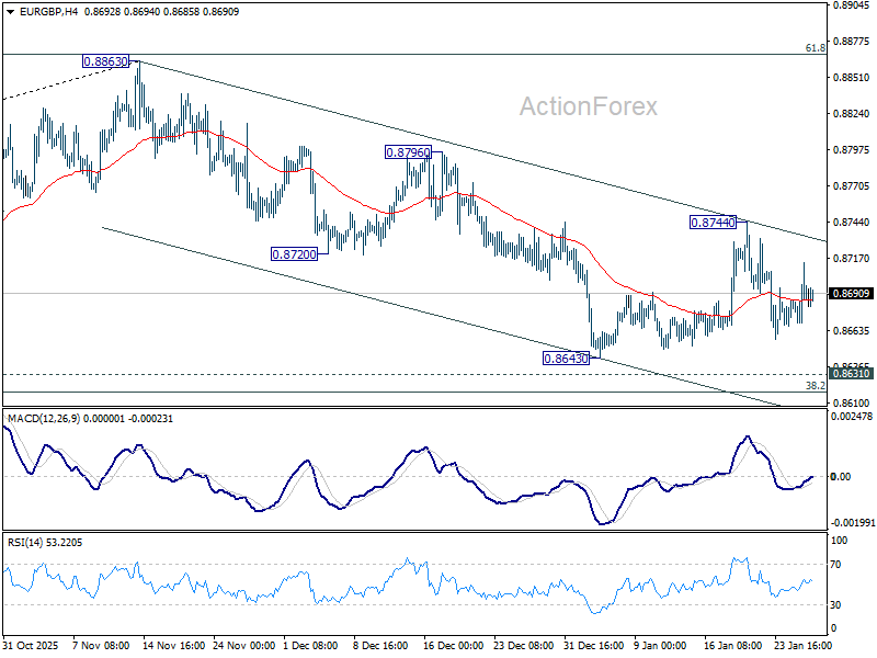 Intraday bias in EUR/GBP stays neutral as range trading continues. But risk will remain on the downside as long as 0.8744 resistance holds. Further decline is expected to 0.8631 cluster support (38.2% retracement of 0.8221 to 0.8663 at 0.8618). Decisive break there will carry larger bearish implications and pave the way to 61.8% retracement at 0.8466.