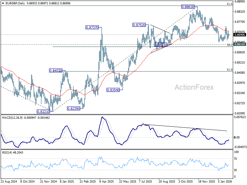 In the bigger picture, rise from 0.8221 medium term bottom (2024 low) is seen as a corrective move. Upside should be limited by 61.8% retracement of 0.9267 to 0.8221 at 0.8867. Sustained trading below 55 W EMA (now at 0.8625) should confirm that this corrective bounce has completed. In this case, deeper fall would be seen back to 0.8201/21 key support zone. However, decisive break of 0.8867 will suggest that EUR/GBP is already reversing whole decline from 0.9267 (2022 high). That should pave the way back to 0.9267.