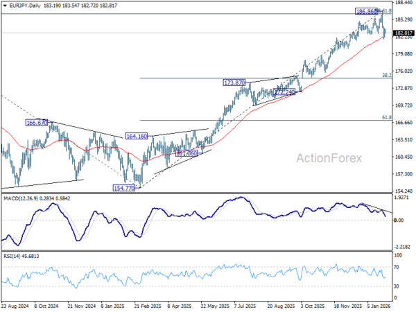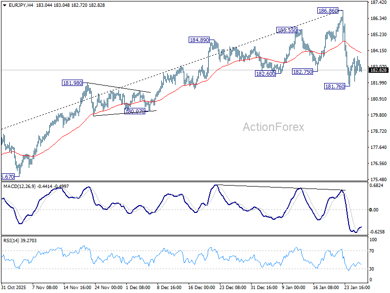 Intraday bias in EUR/JPY is turned neutral for consolidations above 181.76 temporary low. But risk will stay on the downside as long as 186.86 holds, in case of strong recovery. Break of 181.76 and sustained trading below 55 D EMA (now at 182.14) should solidify the case that fall from 186.86 medium term top is correcting whole rise from 154.77. Deeper decline should then be seen to 38.2% retracement of 154.77 to 186.86 at 174.60.