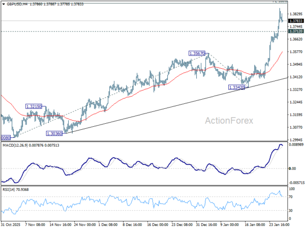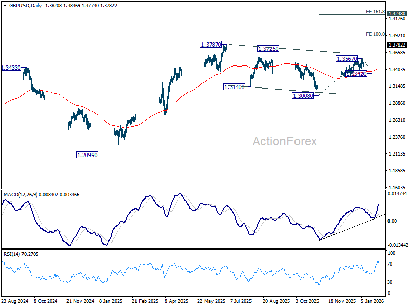 In the bigger picture, rise from 1.0351 (2022 low) is resuming by breaking through 1.3787 high. Further rally should be seen to 1.4284 key resistance (2021 high). Decisive break there will add to the case of long term bullish trend reversal. For now, outlook will stay bullish as long as 1.3008 support holds, even in case of deep pullback.