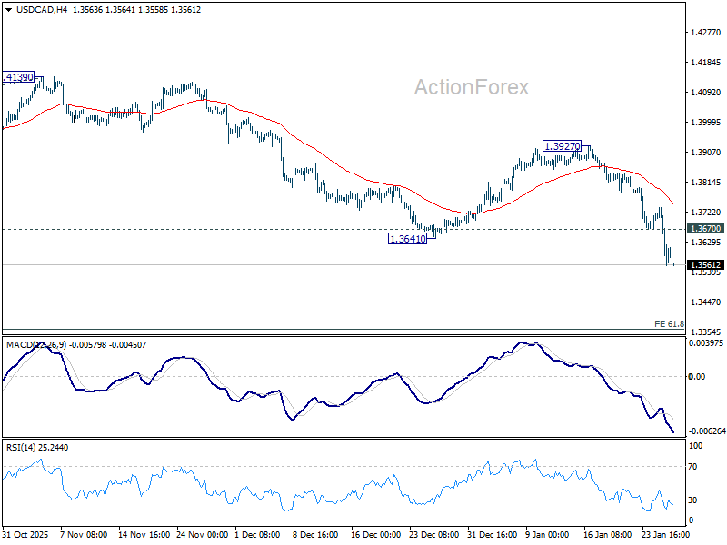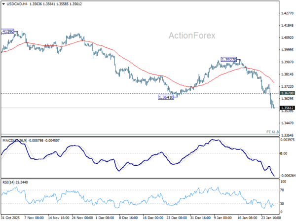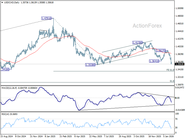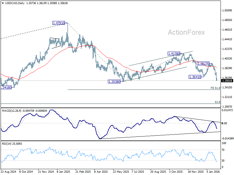 Intraday bias in USD/CAD remains on the downside for retesting 1.3538 low. Firm break there resume whole fall from 1.4971. Next target is 61.8% projection of 1.4791 to 1.3538 from 1.4139 at 1.3365. On the upside, above 1.3670 minor resistance will turn intraday bias neutral and bring consolidations, before staging another fall.