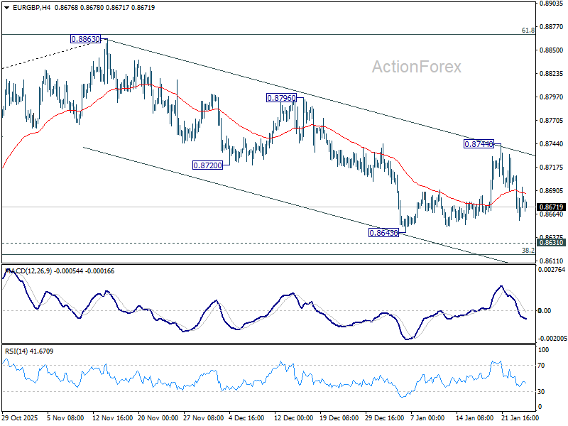 Intraday bias in EUR/GBP stays on the downside and deeper fall should be seen to 0.8631 cluster support (38.2% retracement of 0.8221 to 0.8663 at 0.8618). Decisive break there will carry larger bearish implications and pave the way to 61.8% retracement at 0.8466. Risk will now stay on the downside as long as 0.8744 resistance holds, in case of recovery.