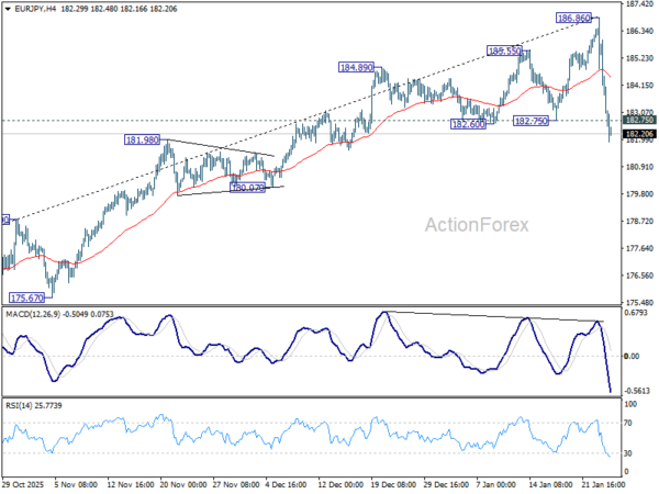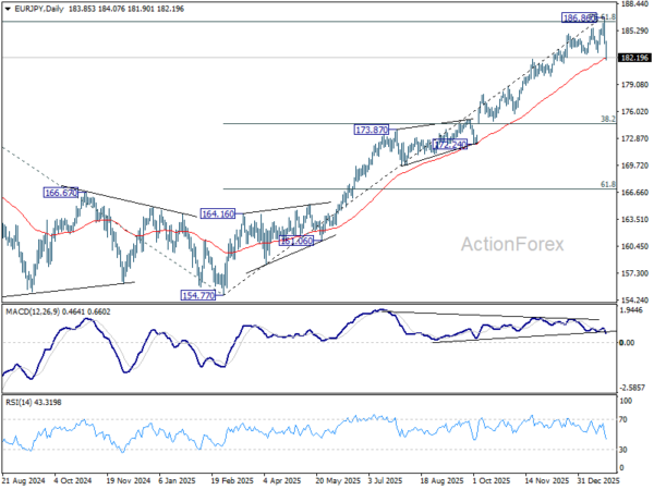 EUR/JPY's break of 182.75 support suggests medium term topping at 186.86 on bearish divergence condition in D MACD. Intraday bias is back on the downside. Sustained trading below 55 D EMA (now at 181.99) will solidify the case that it's already correcting whole rise from 154.77. Deeper fall should then be seen to 38.2% retracement of 154.77 to 186.86 at 174.60. For now, risk will stay on the downside as long as 186.86 holds, in case of recovery.