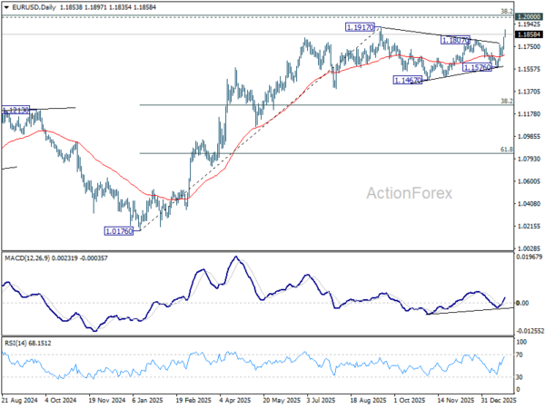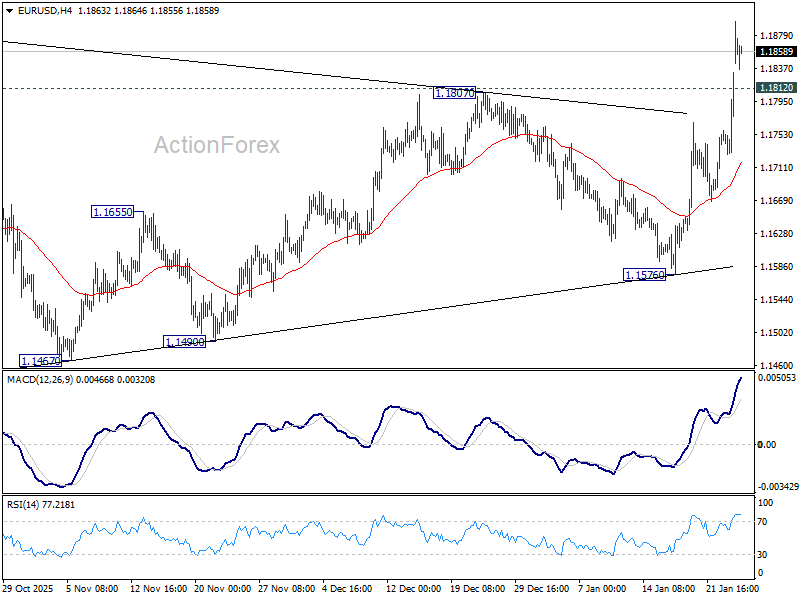 Intraday bias in EUR/USD stays on the upside for retesting 1.1917 key resistance. Firm break there will resume larger up trend. On the downside, below 1.1812 minor support will mix up the outlook and turn intraday bias neutral again.