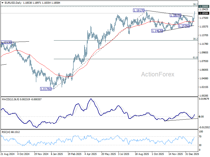 In the bigger picture, as long as 55 W EMA (now at 1.1443) holds, up trend from 0.9534 (2022 low) is still in favor to continue. Decisive break of 1.2 key psychological level will carry larger bullish implication. However, sustained trading below 55 W EMA will argue that rise from 0.9534 has completed as a three wave corrective bounce, and keep long term outlook bearish.