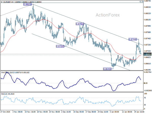 Intraday bias in EUR/GBP is turned neutral first with current retreat. On the downside, firm break of 0.8691 resistance turned support will suggest that rebound form 0.8643 has completed as a corrective bounce. Rejection by 55 D EMA (now at 0.8717) will keep the fall from 0.8863 intact. Intraday bias will be back on the downside for 0.8643 low first, and then 0.8631 cluster support (38.2% retracement of 0.8221 to 0.8663 at 0.8618).