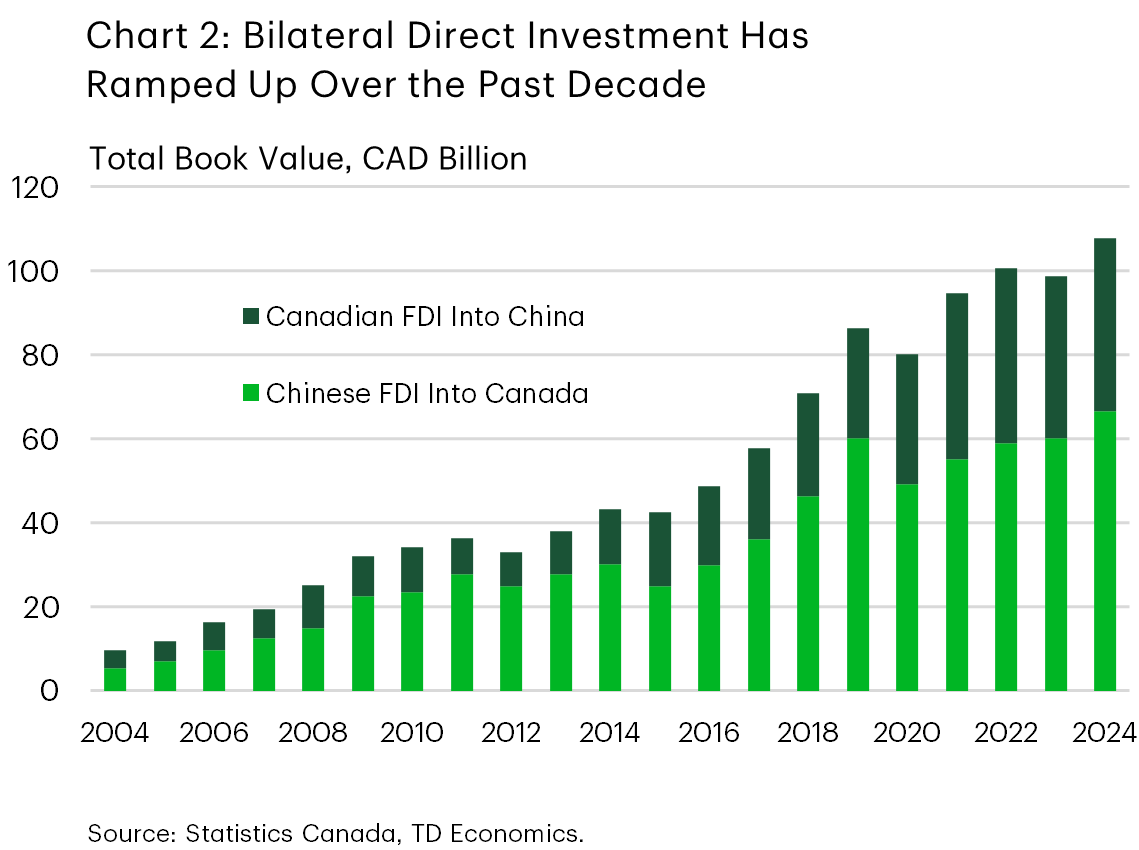 Historically, Canada and China have maintained a significant investment partnership. As of 2024, China (including Mainland China and Hong Kong) ranked as the fifth largest source of foreign direct investment (FDI) into Canada (Chart 1). What’s more, bilateral FDI stocks between Canada and China reached over 100 billion in 2024—the highest level on record and more than double the level recorded a decade ago (Chart 2). Compositionally, Canadian FDI into China accounts for around $40 billion of the cumulative bilateral stock, while Chinese FDI flows account for the remaining $65 billion.