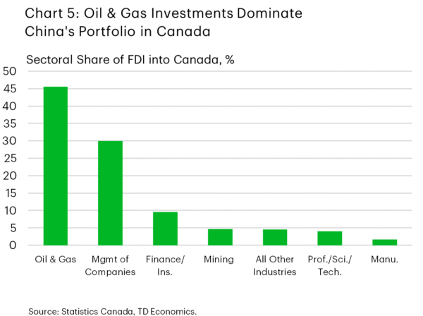 While today’s partnership may not be as transformative as the policy changes from two decades ago, China could steadily claim a larger share of Canada’s incoming investment in the coming years. Assuming total Canadian inward FDI grows at an organic 5 % annually, it’s reasonable that Chinese investment could cumulatively add another $15 billion (over the next five years) beyond what would likely occur without a new partnership (Chart 4). In this base scenario, China’s portion of total Canadian incoming FDI is projected to steadily return to 5.3%, reaching its peak level from 2019. A more optimistic, but not improbable scenario, is one where Chinese FDI growth into Canada significantly outpaces other nations, leading to upwards of $25 billion in excess investment over the next 5 years, equivalent to 6% of total inward Canadian FDI. All told, we see the stock of Chinese FDI in five year’s time being somewhere in the range of $90-100 billion, compared to Canadian total inward FDI of around $1.7 billion.
