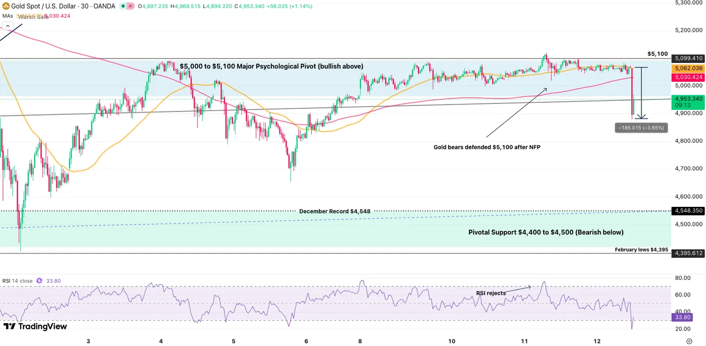 - Rebound losing momentum: Gold staged a sharp 15.7% bounce from the $4,405 low but is now showing signs of bullish exhaustion below the key $5,170 resistance, with price action stalling above the 20-day moving average at $4,940.