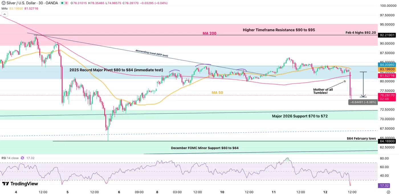 Silver is now pressing into a critical near-term resistance cluster around 85–86, a zone that could determine whether the sharp selloff from 121.82 has already bottomed at 63.98 or whether another leg lower is still ahead. The area combines 55 4H EMA (now at 85.27) and 38.2% retracement of 121.83 to 63.98 at 86.07, creating a technically dense barrier. Price reaction here is likely to set the tone for the next multi-week move.