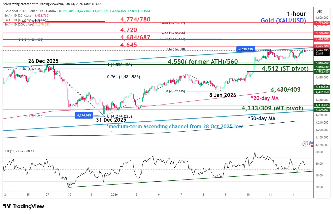 Thereafter, the yellow metal underwent a bullish reversal and surged above its prior all-time high of US$4,550, set on 26 December 2025. In today’s Asia session, 14 January 2026, it traded firmer, rallied by 0.8% to hit another intraday all-time high of US$4,639 on the time of writing.