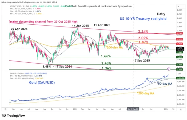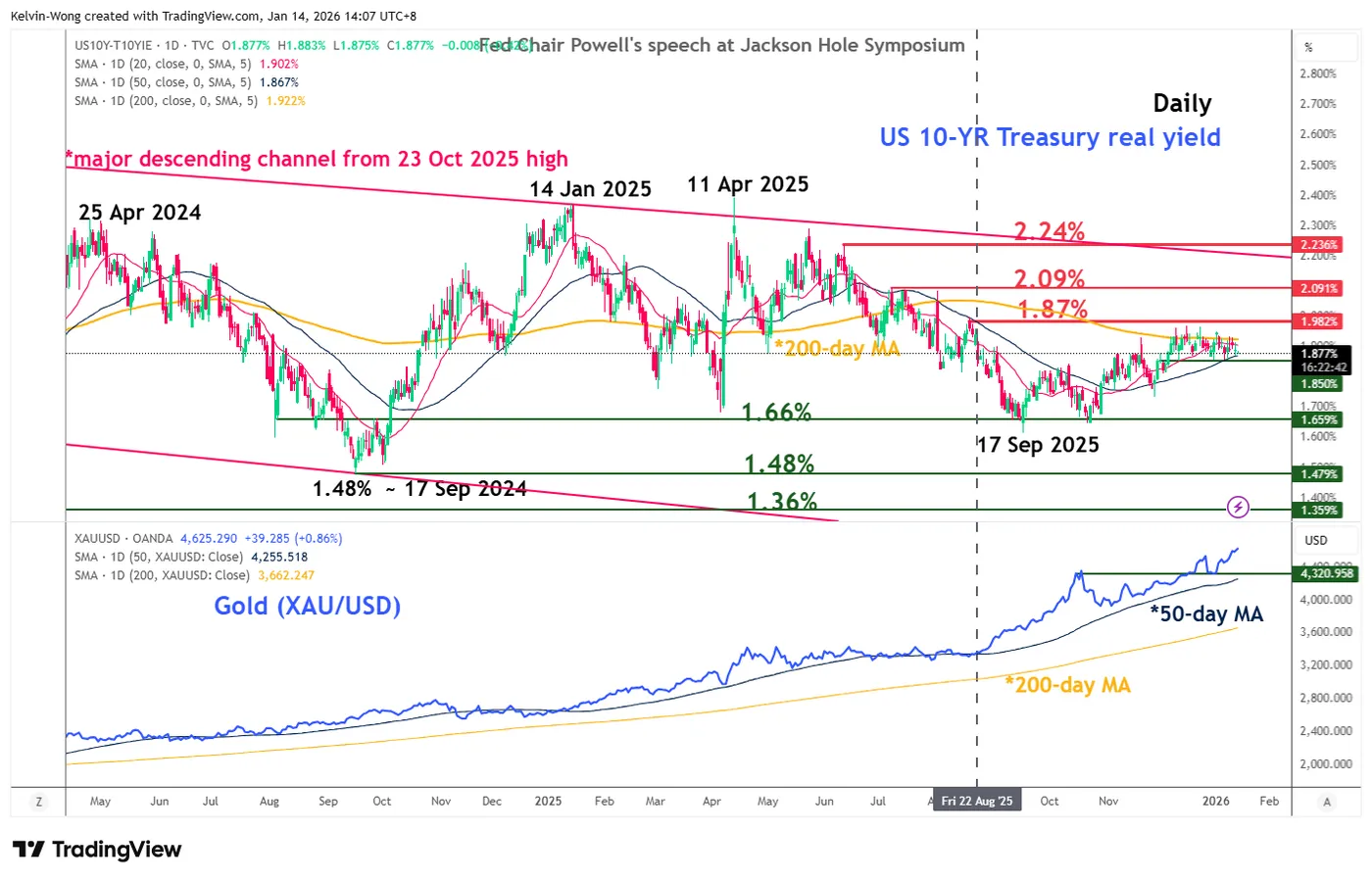 Fig. 2: 10-year US Treasury real yield major trend with Gold (XAU/USD) as of 14 Jan 2026 (Source: TradingView)