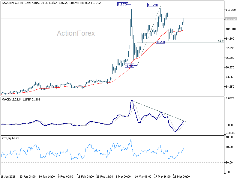 The extended rebound in Brent crude suggests that the pullback from 119.24 has likely completed at 96.26, just ahead of 61.8% retracement of 81.41 to 119.24 at 95.86. Further gains are expected as long as the 55 4H EMA (now at 103.73) holds. The next target is a retest of the 119.24–119.70 resistance zone. Decisive break above this area would confirm that the broader uptrend is resuming.