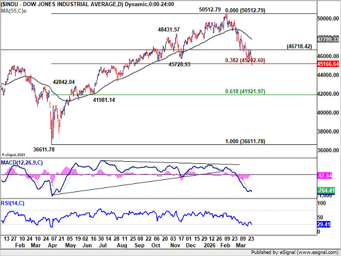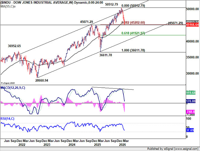 DOW’s decline from 50,512.79 resumed last week and is now approaching the key support zone around the 45k psychological level. This area is reinforced by 38.2% retracement of 36,611.78 to 50,512.79 at 45,202.26, as well as 2024 peak at 45,071.29, making it a critical confluence zone.
