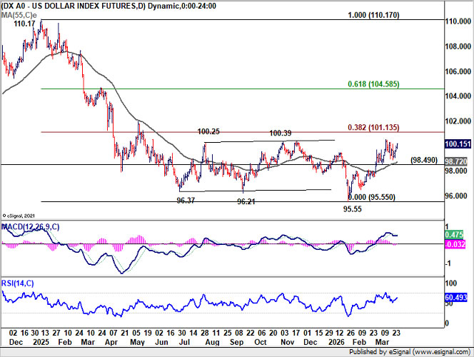 Dollar Index hovered inside established range last week. With 98.49 support intact, further rally is still expected. Rise fro 95.55 low should extend to key resistance at 38.2% retracement of 110.17 to 95.55 at 101.13. Reaction from there will be important to determine Dollar Index's medium term trend.