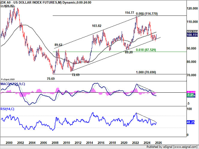 More importantly, it should be emphasized that Dollar Index has just rebounded from the multi decade channel floor. Firm break of 55 M EMA (now at 102.31) will indicate that the whole down trend from 114.77 (2022 high) has completed as a three wave correction to 95.55. The would open up the case for resuming the up trend from 70.69 (2008 low) through 114.77 in the medium term.