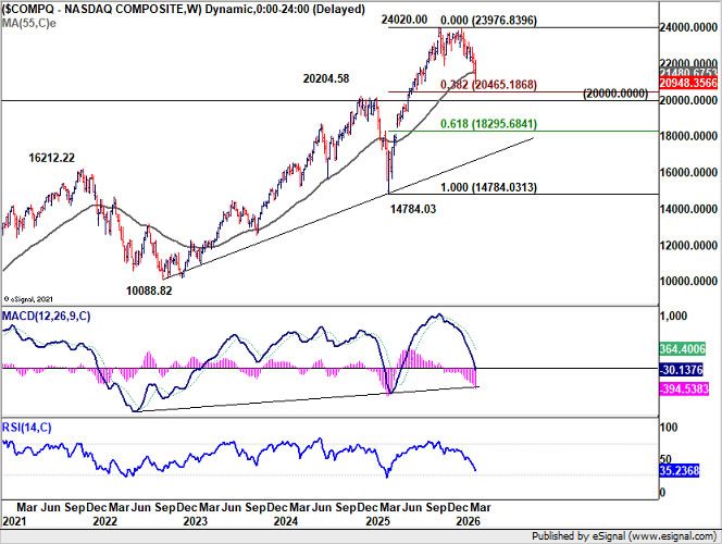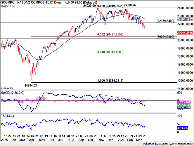 NASDAQ presents a similar technical picture. With current downside momentum remaining strong, the decline from 24,020.00 is likely to extend toward 38.2% retracement of 14,784.03 (2025 low) to 24,020.00 at 20,465.18.