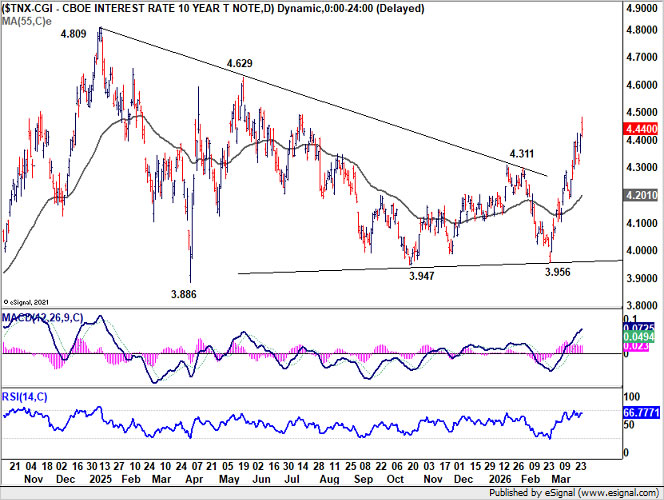 The next key target is 4.629 resistance. Firm break there will solidify the case that 10-year yield is actually extending the rise from 3.603 (2024 low), and set up further rise through 4.809 resistance to take on 4.997 (2023 high).