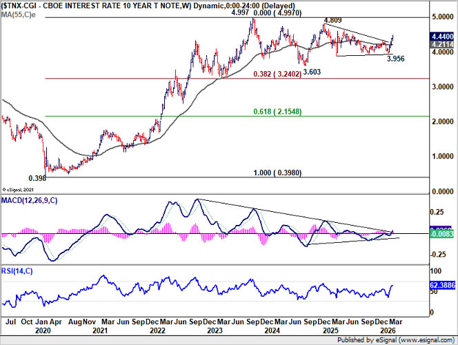 The US 10-year yield’s rally from 3.956 remains in an acceleration phase, as indicated by D MACD. While near-term volatility is possible, further upside is favored as long as 55 D EMA (now at 4.201) holds.