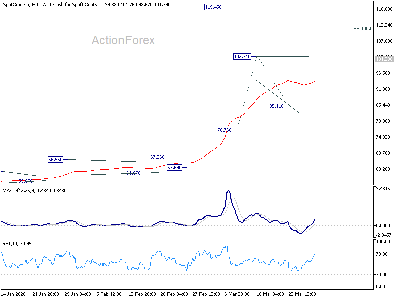 WTI crude’s sharp rebound indicates that the correction from 102.31 has likely completed at 85.11. Immediate focus is now on 102.31 resistance. Firm break above this level would resume the rebound from 76.76, targeting 100% projection of 76.76 to 102.31 from 85.11 at 110.66, with further upside potential toward a retest of the 119.45 high.